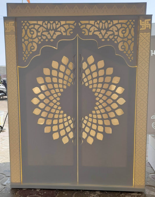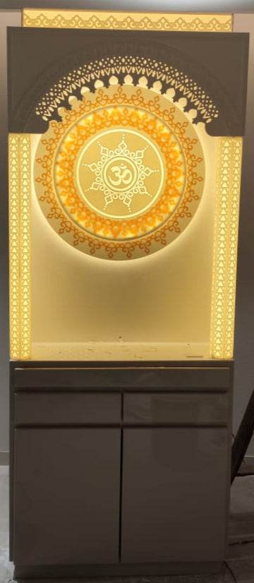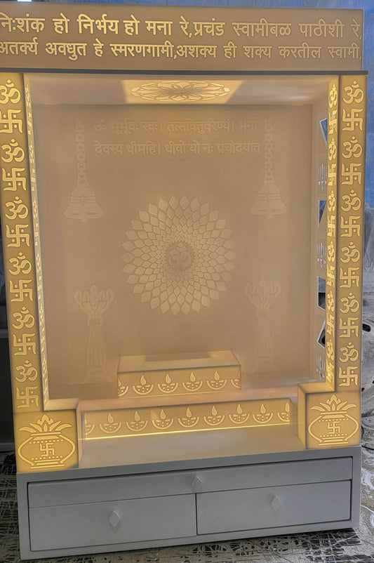 Experience the ethereal glow of our signature 3D Backlit corian Temples, where deities come to life in breathtaking detail. Discover the perfect harmony of form and function with our designs featuring integrated storage and elegant doors. Made from premium, seamless Corian, our temples offer unparalleled durability and a pristine, easy-to-maintain finish.