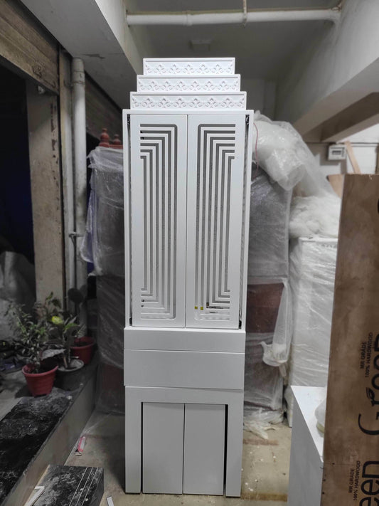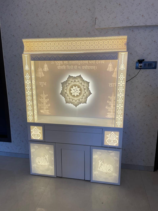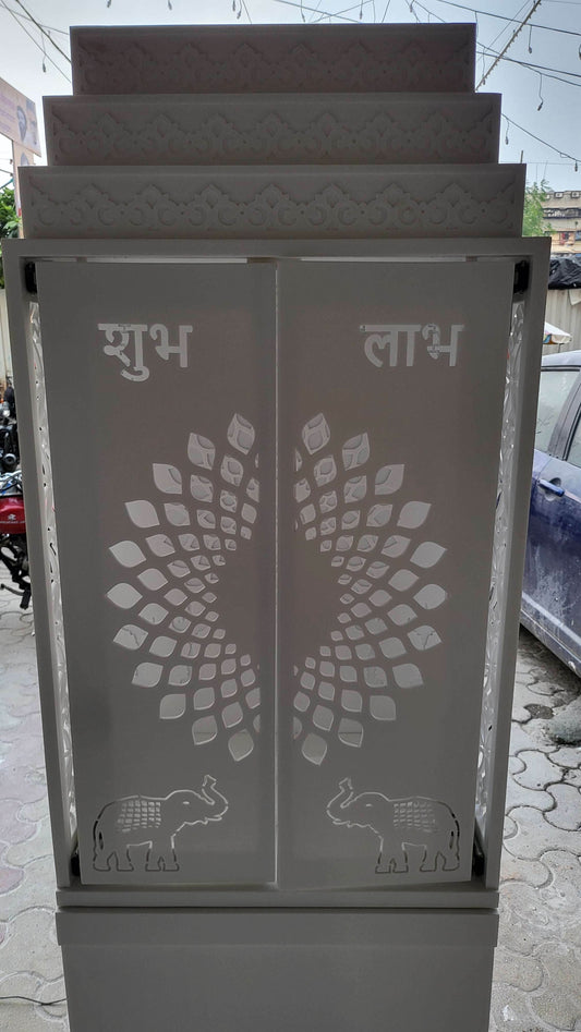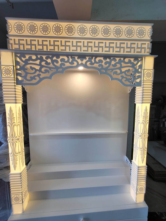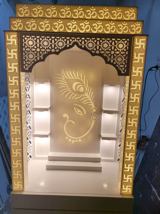 Corian mandir for home (customised pillars with swatik design and ganesha + peacock backdrop)